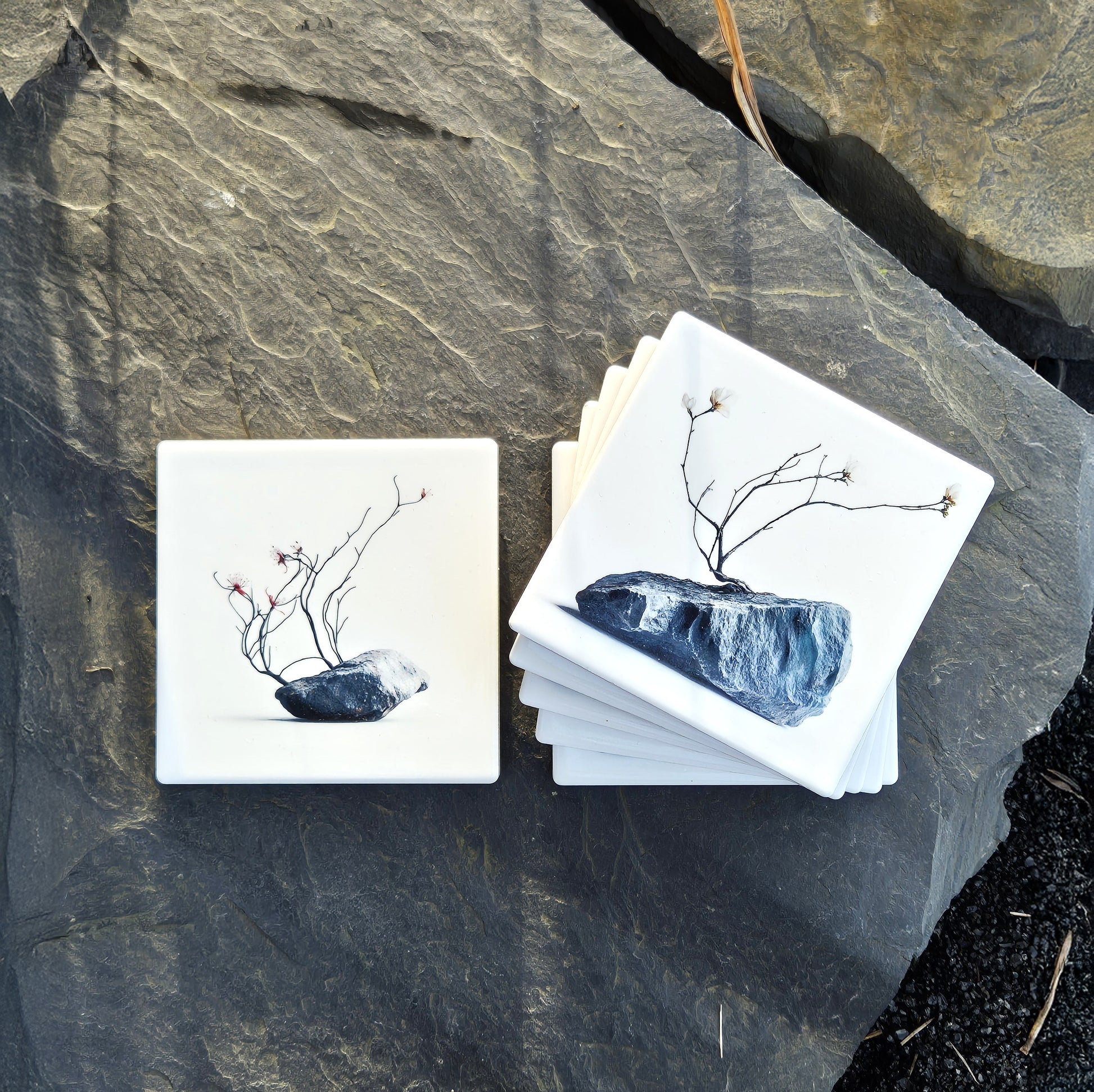 A calm and minimalist set of ceramic coasters inspired by the quiet strength of stone, balance, and natural stillness.
